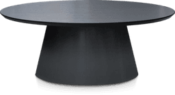 Zuna sofabord i Ø110. Bordet er i finert eik, lakkert sort selges fra utstilling. Merk noen bruksmerker på overflaten.